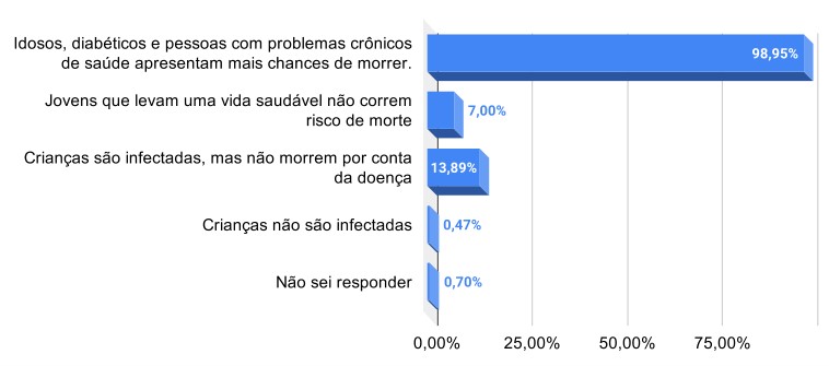 Quando questionados sobre o efeito do vírus em diferentes grupos populacionais, 99% dos entrevistados souberam reconhecer que idosos, diabéticos e pessoas com problemas crônicos apresentam mais chances de morrer em decorrência da Covid-19 (Figura 9). Entretanto, mais de 20% dos entrevistados sinalizaram ao menos uma informação errônea relacionada ao efeito da doença sobre jovens e crianças, uma vez que, embora, nesses dois grupos, a taxa de mortalidade seja menor do que nos idosos, a possibilidade de morte existe já havendo sido relatados diversos casos.