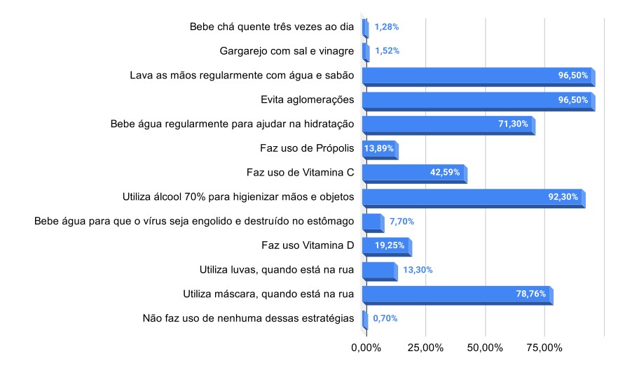 Constata-se que uma parcela considerável da população do RJ detém conhecimento acerca das medidas preventivas estabelecidas pelas organizações de saúde como, por exemplo (Figura 10): lavar as mãos regularmente com água e sabão – o sabão é capaz de atuar destruindo o envelope viral; evitar aglomerações a fim de reduzir a velocidade de propagação; utilizar máscaras para reduzir a dispersão do vírus; utilizar álcool 70% para higienizar mãos e objetos. Nota-se, ainda, que estratégias relacionadas ao aumento da imunidade (mas que não reduzem a chance de contágio) como o uso de própolis e de vitaminas C e D, além de certa preocupação com a hidratação vêm sendo adotadas por parte da população. Apesar disso, artifícios não eficazes para o combate à pandemia vêm sendo adotados por uma parcela da população em razão da disseminação de informações falsas, tais como: beber água frequentemente para que o vírus seja engolido e destruído no estômago; fazer gargarejo com sal e vinagre; beber chá quente. Por conseguinte, é importante salientar a importância da verificação da veracidade de informações recebidas.