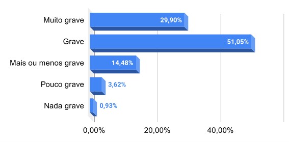 Observou-se que 84,4% dos participantes não acreditam que a população esteja respeitando as orientações das autoridades com relação às medidas de distanciamento social propostas. Esse quadro reflete a desconfiança de uma grande parcela dos entrevistados com relação acerca da capacidade de entendimento e cumprimento de medidas coletivas por parte da população do RJ, havendo 80,9% dos participantes, por conseguinte, classificado a situação atual da pandemia no Brasil como Grave ou Muito grave, o que reforça esta visão pouco otimista (Figura 11).