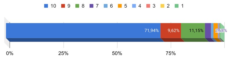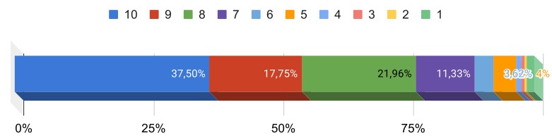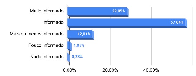 De modo símile ao cumprimento de medidas de distanciamento social para evitar o contágio da população pelo novo CoV, estar informado quanto aos fatos da pandemia e evitar o alarmismo e a rápida propagação de conteúdos sem a devida verificação é de extrema importância. Dentre os entrevistados, 86,69% afirmam estar Muito Informado ou Informado sobre a pandemia (Figura 12). A porcentagem que afirma estar Pouco ou Nada informado é bastante pequena. Ademais, em uma escala de 1 a 10 sobre a verificação das informações recebidas quanto à pandemia, 88,5% dos entrevistados deram nota igual ou maior que 7, demonstrando um bom grau de preocupação (Figura 13).