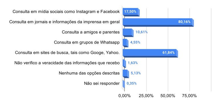 Embora a verificação de informações seja fundamental, os meios utilizados para tal são tão importantes quanto ela. Quando perguntados sobre os meios utilizados para verificar a veracidade das informações que chegam a eles, apenas 1,6% afirmam não verificar veracidade das informações que recebem. Além disso, 17,5% declaram consultar em mídias sociais como Instagram e Facebook, lugares onde a disseminação de informações não verídicas pode ocorrer mais facilmente. Porém, é interessante destacar que 80,1% dos entrevistados dizem verificar as informações em jornais, um meio de divulgação que, em geral, apresenta por rotina a verificação das informações divulgadas (Figura 14).