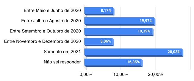 Quando questionados sobre o retorno da vida à completa normalidade, 16,3% não souberam responder. É tácito que essa não é uma tarefa trivial e até mesmo pesquisadores da área têm tido dificuldades para apresentar uma data final para a pandemia, uma vez que existe a dependência do avanço de pesquisas científicas, de decisões políticas, de um maior conhecimento do vírus, etc. 28% dos entrevistados acredita que apenas em 2021 a vida voltará à completa normalidade (Figura 15).