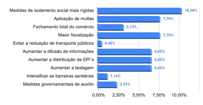 Os participantes foram convidados a deixar sugestões e/ou a apontar ações que deveriam ser intensificadas na sua região para aumentar o combate à pandemia. As respostas foram agrupadas por categorias e estão descritas na Figura 16. Observa-se que ações de controle e fiscalização foram as mais sugeridas.