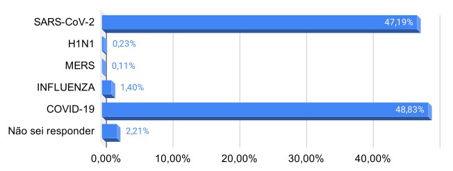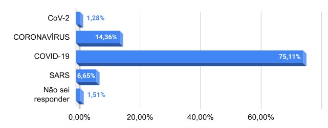 O vírus causador da atual pandemia é chamado de SARS-CoV-2. Dentre os resultados apresentados na Figura 4, observa-se que 52,81% dos participantes não foram capazes de identificar o nome do vírus de maneira correta e 48,83% confunde-o com o nome da doença. Quando questionados sobre o nome da doença causada pelo novo CoV (Figura 5), 75% dos participantes foram capazes de identificá-la de maneira correta: Covid-19.