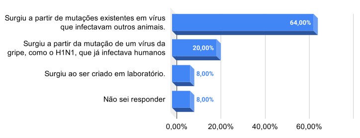 Identifica-se que 64% dos entrevistados apontaram que o vírus surgiu a partir de mutações existentes em vírus que infectavam outros animais. Ademais, 36% marcaram outras opções (Figura 6). É importante destacar que estudos genômicos comparativos indicam, de fato, a origem zoonótica do novo CoV e descartam o surgimento a partir de manipulação laboratorial (ANDERSEN et al., 2020).