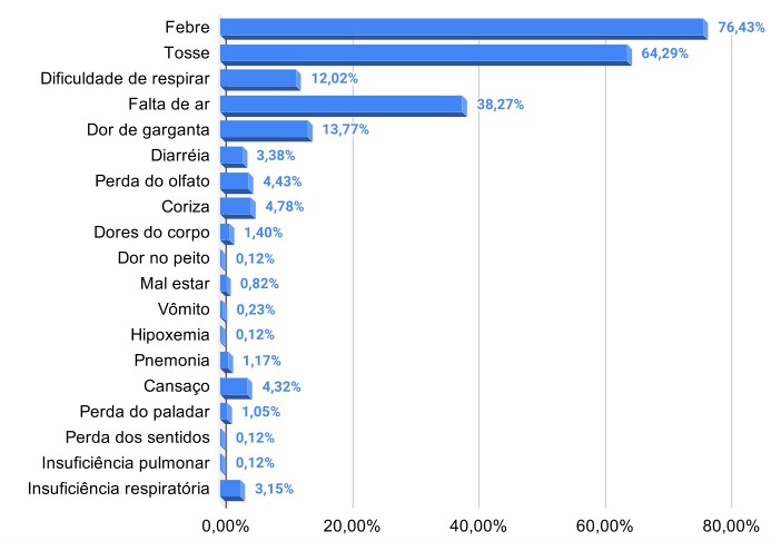 Nota-se, na Figura 7, que febre, tosse e falta de ar representam os sintomas mais conhecidos pelos participantes, seguidos de dor de garganta e dificuldade de respirar. Os dados demonstram que uma boa parcela da população avaliada conhece os sintomas iniciais mais comuns da Covid-19.