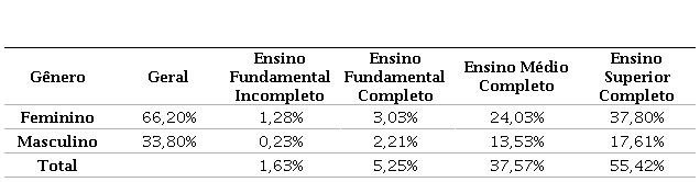 Observa-se, na Tabela 1, uma maior participação de mulheres na pesquisa. Verifica-se, ainda, que 55,42% das respostas obtidas são de pessoas que possuem Ensino Superior Completo. A amostragem do presente estudo não reflete a formação da população do estado do RJ, da qual, segundo o Instituto Brasileiro de Geografia e Estatística (IBGE), em 2010, apenas 10,9% apresentava Ensino Superior Completo (IBGE, 2010).