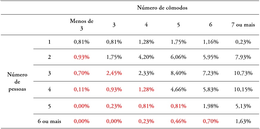 Por conta das vias de transmissão do vírus causador da Covid-19, é imprescindível adotar medidas de distanciamento social. Assim, é possível reduzir a velocidade de propagação da pandemia, garantindo a estabilidade do sistema de saúde pública do país. Em situações nas quais há um indivíduo com suspeita ou diagnosticado com a doença, o isolamento deve ser feito também dentro do domicílio. Essa não é uma tarefa fácil para pessoas que vivem em residências com adensamento domiciliar excessivo2, uma vez que as orientações3 de isolamento para o combate à Covid-19 indicam que o doente deva permanecer em quarto/cômodo individual, isolado por 14 dias. Desse modo, o problema de moradia torna-se extremamente crítico para o combate ao vírus. Verifica-se, na presente pesquisa, que aproximadamente 10,0% dos participantes vivem em residências com adensamento domiciliar de uma pessoa ou mais por cômodo (Tabela 2). Para esse grupo de pessoas, o isolamento domiciliar deverá ser conduzido com uma rígida rotina de higienização de ambientes, em conjunto com medidas auxiliares, tais como o uso constante de máscaras, ampla ventilação e seleção de um único membro da família como cuidador.