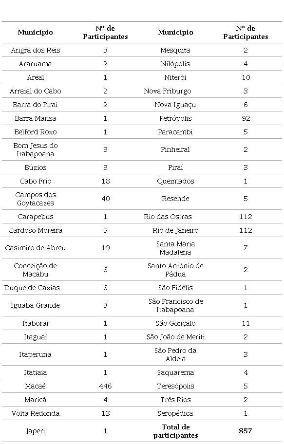 Os dados foram coletados, de forma anônima, entre os dias 28/04/2020 a 07/05/2020, através de questionário on-line divulgado em aplicativos de mensagens (Whatsapp) e redes sociais (Facebook e Instagram). Os participantes foram esclarecidos a respeito da pesquisa e tiveram o direito de não participar. Os dados coletados foram filtrados manualmente para remover duplicatas, respostas abortadas e participantes residentes em regiões fora do escopo da pesquisa. Após a filtragem, 857 respostas de pessoas residentes no estado do Rio de Janeiro e com mais de 18 anos foram avaliadas. A distribuição das respostas entre os municípios encontra-se no Apêndice A. Elementos estruturados foram utilizados no questionário, no qual apenas uma alternativa era possível como resposta. Uma avaliação descritiva dos dados coletados foi realizada.