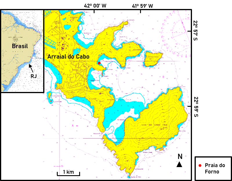 O presente estudo foi realizado em Arraial do Cabo, RJ, costa sudeste do Brasil (22º 56’ 06.0”S e 42° 00’ 56.1”W), onde ocorre o fenômeno da ressurgência (VALENTIN, 1984). Esse fenômeno consiste no afloramento das Águas Centrais do Atlântico Sul (ACAS) que são frias e ricas em nutrientes e que, portanto, fertilizam a cadeia trófica no encontro com as correntes tropicais, tornando a região mais rica e com abundante biodiversidade (CARNEIRO; VIEIRA; COLUCCI, 2012).