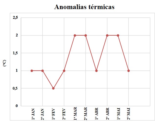 Pôde-se observar que, em janeiro, a anomalia térmica manteve-se constante em 1,0 °C nas duas quinzenas, apresentando queda de 0,5 °C na primeira quinzena de fevereiro, e retornando ao valor de 1,0 °C na segunda quinzena do mesmo mês. Posteriormente, o valor de anomalia térmica observada foi de 1,0 °C durante a primeira quinzena de abril e na segunda quinzena de maio. Os valores máximos de anomalia (2,0 °C), foram observados ao longo de março, na segunda quinzena de abril e na primeira de maio (Figura 3).