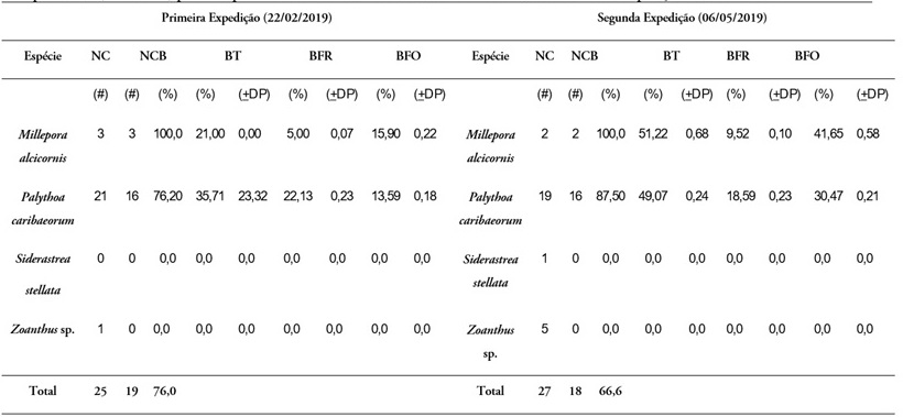 Palythoa caribaeorum – foi a espécie de cnidário bentônico mais abundante. Do total de colônias observadas, 76,20% foram afetadas por branqueamento durante a primeira expedição, em que ocorreu uma anomalia térmica de 1,0 °C (Figura 3). O branqueamento afetou 35,71% da área colonial deste zoantídeo na primeira expedição, destes 22,13% foi por branqueamento fraco e 13,59% foi por branqueamento forte (Tabela 1). Na segunda expedição, o branqueamento afetou 87,5% do número total de colônias observadas quando ocorreu uma anomalia de 2,0 °C durante a segunda quinzena de abril e primeira quinzena de maio (Figura 3). A área colonial afetada por branqueamento foi de 49,07% - destes 18,59% foi por branqueamento fraco e 30,47% foi por branqueamento forte (Tabela 1). O teste de Kruskal-Wallis não mostrou diferença significativa entre a primeira expedição e a segunda expedição para os parâmetros branqueamento total (H =29,00; p > 0,05), branqueamento fraco (H = 42,50; p > 0,05) e branqueamento forte (H = 42,50; p > 0,05).