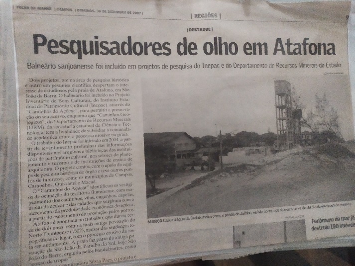 Nos últimos anos, pesquisando os arquivos públicos, como jornais, livros, revistas e reportagens de pessoas e lugares da região, nota-se que Atafona tem recebido a atenção da imprensa (Figura 3) local e nacional pelo forte processo de erosão costeira que a impacta. Pesquisas apontam que o fenômeno de erosão tem relação com a própria formação gradual do delta do Rio Paraíba do Sul, que já deixou cicatrizes evidentes na planície costeira (SOFFIATI, 2017). A observação dessa situação desperta o interesse de compreender os modos de vida e as dinâmicas de coexistências locais, relacionadas a percepção ambiental e aos fatores adotados no enfrentamento da vulnerabilidade associada ao fenômeno da erosão/progradação que atinge os moradores da praia de Atafona.