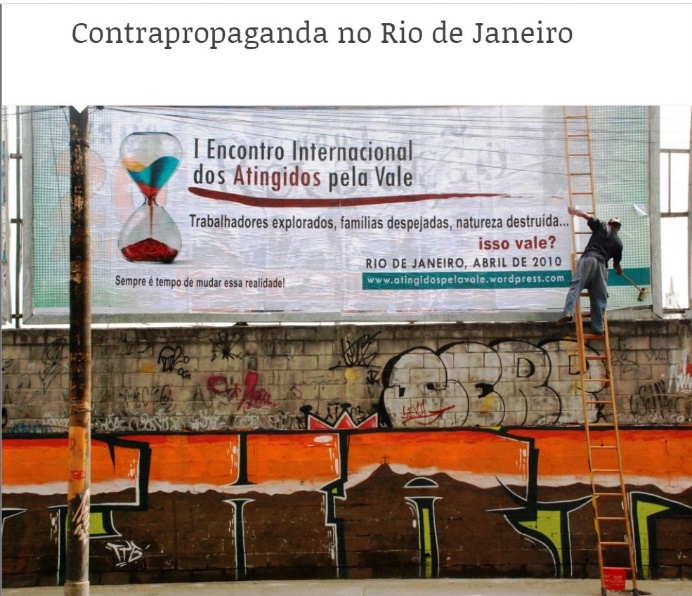 Na manhã do hoje (12/4), um outdoor bem diferente passou a ocupar espaço na Avenida Presidente Vargas, uma das mais movimentadas da capital carioca. Nele, uma mensagem provocativa: “trabalhadores explorados, famílias despejadas, natureza destruída. Isso vale?”. Para nós, que integramos I Encontro Internacional dos Atingidos pela Vale, a resposta é não. Essa contrapropaganda faz frente à visão massivamente veiculada pela empresa, que mostra funcionários sorridentes, trabalhando a serviço do “progresso” do país. Mas esse progresso serve a quem? É promovido a custo de quê? (Página web da AIAAV)13