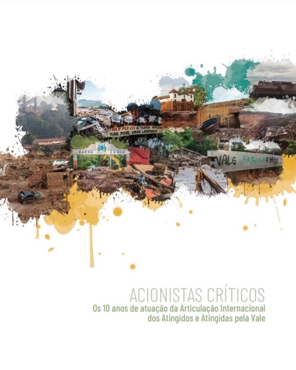 Se, como afirmamos, seguindo a proposta de Ulrich Beck, é possível falar de políticas de invisibilização dos riscos, associadas às estratégias das empresas de mineração, por sua vez, podemos identificar como “políticas de visibilização” as ações que movimentos críticos, como a AIAAV, adotam como peça-chave do seu fazer político. Dez anos depois do I Encontro, em 2020, a AIAAV lança a publicação “Acionistas críticos: os 10 anos de atuação da articulação internacional dos atingidos e atingidas pela Vale” (AIAAV, 2020). Logo na capa da publicação, a iconografia dos desastres: