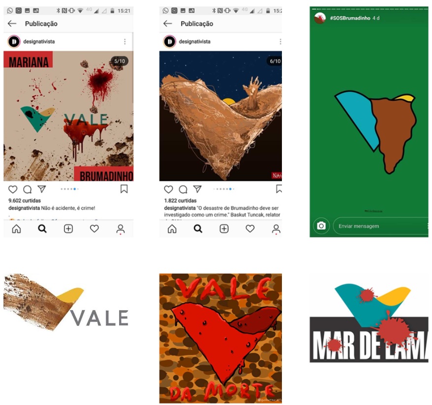 Após o desastre de Brumadinho, em janeiro de 2019, as redes sociais (Instagram e Facebook) foram invadidas, sob hashtags como de #somotodosatingidos, #valeassassina, #nãofoiacidente, por imagens16 que parecem reproduzir, ou se inspirar ao menos, no ato iconoclasta proposto pela AIAAV ao desconstruir o logo da Vale e criar, a partir desse ato quase antropofágico, sua própria identidade.