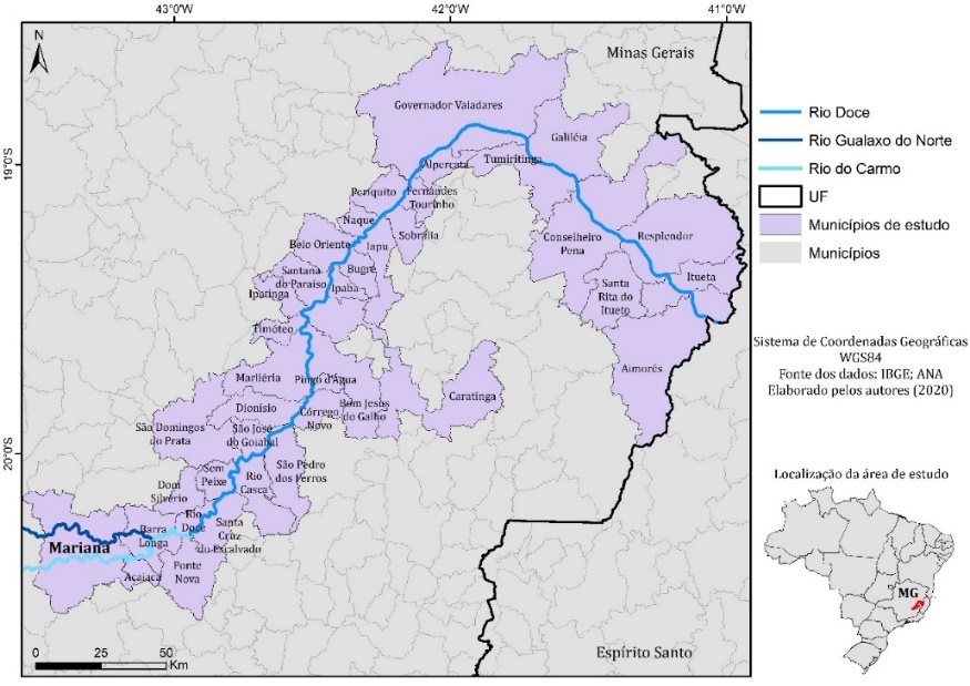 A onda de rejeitos acompanhou os rios Gualaxo do Norte, Carmo e Doce, impactando os estados de Minas Gerais e Espírito Santo. No entanto, este trabalho terá como foco apenas os municípios atingidos no estado de Minas Gerais. Para compor a área de estudo e posterior análise de impactos do desastre, foram considerados os 38 municípios mineiros relatados como impactados pelo Centro Nacional de Gerenciamento de Riscos e Desastres – CENAD2, e também todos os que estavam próximos aos rios, como mostra a Figura 1. O rompimento da barragem ocasionou a morte de 18 pessoas e 1 desaparecimento (A TRAGÉDIA…, 2016).