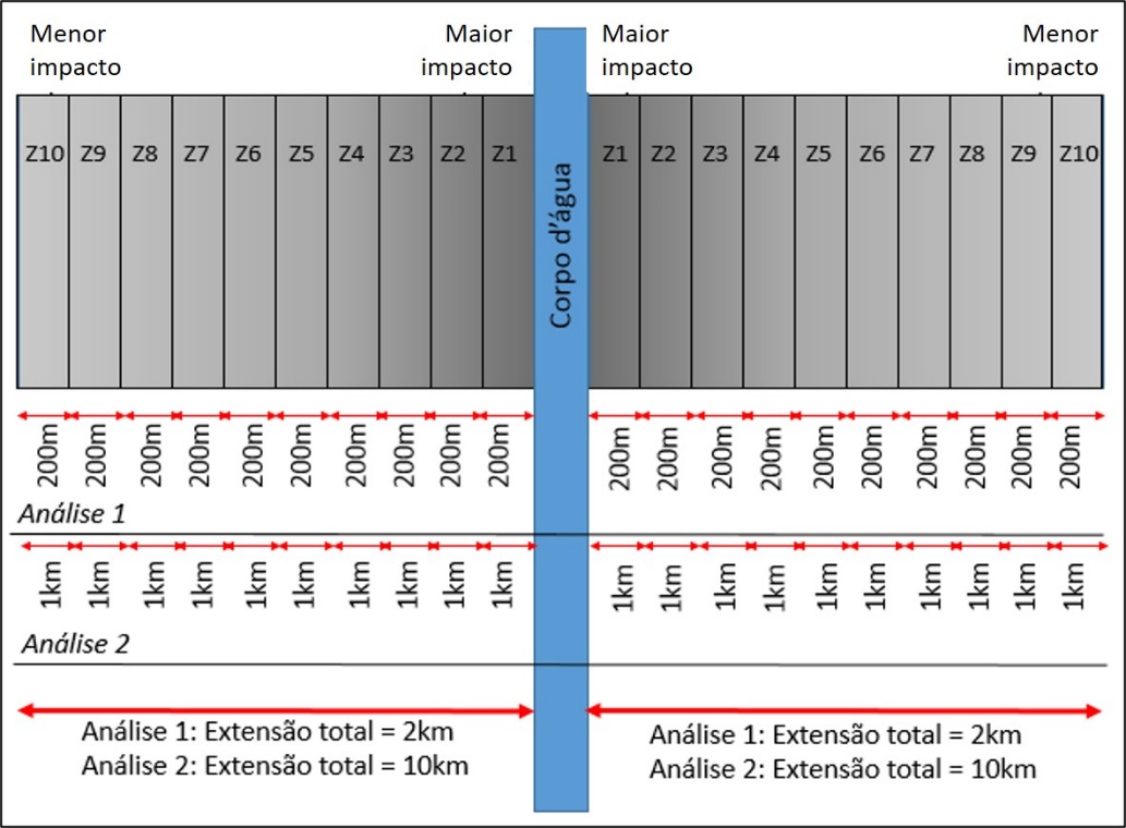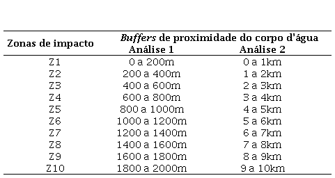 Para delimitar o grau de impacto, foram consideradas duas divisões de análises de impacto: buffer de proximidade a cada 200 m e a cada 1 km, pensando na compatibilização entre a distância do buffer e o tamanho das células da grade estatística do IBGE. Para cada análise foram gerados 10 níveis de buffers, no software Terraview 4.2.2, totalizando 10 zonas de impacto (Tabela 1 e Figura 3), o que significa que a primeira análise consegue atingir uma população localizada numa extensão de 2 km a partir do rio considerado, e que, na segunda análise, a extensão totaliza 10 km.