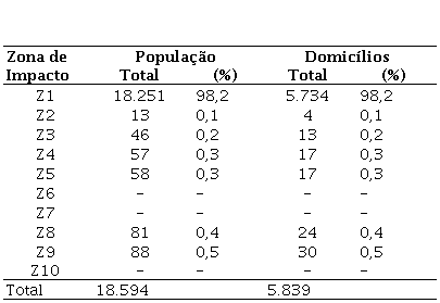 Com relação à análise 1, verificou-se que todas as células analisadas se localizavam em área urbana, em decorrência da escolha da distância do buffer, de níveis de 200 m, coincidindo com o tamanho da célula urbana. A Tabela 2 mostra que as informações foram obtidas para cada zona de impacto, e a Figura 6 traz a distribuição espacial da população considerada na análise 1. A Z1, de maior impacto, concentrou um total de 18.251 pessoas e 5.734 domicílios, correspondendo a 98,2% do total de população e domicílios ocupados considerados na análise 1. Foi possível observar também que algumas zonas de impacto não apresentaram nenhuma célula com população e domicílio (Z6, Z7 e Z10).