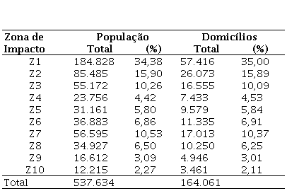 Nesta análise, a população e os domicílios estavam localizados, em sua maioria, na zona de maior impacto (Z1), totalizando 184.828 pessoas (correspondendo a 34,38% do total de pessoas consideradas na análise 2) e 57.416 domicílios (correspondendo a 35% do total de domicílios considerados na análise 2), como mostra a Tabela 3. Em seguida, a segunda zona de maior impacto (Z2) apresentou a segunda maior concentração de pessoas e domicílios. Já as zonas de menor impacto (Z9 e Z10) apresentaram as menores concentrações de domicílio e de população.