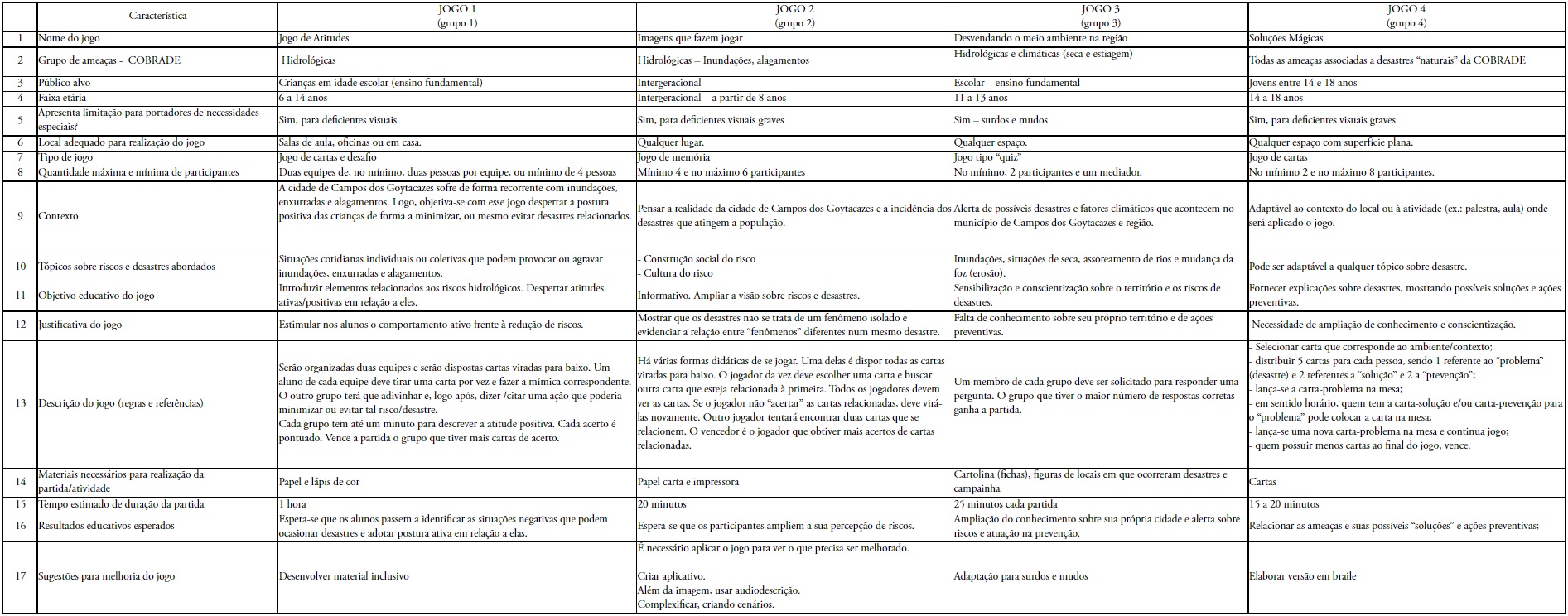 Muitas das características e formas de abordagem que devem ser buscadas no desenvolvimento de ações ERRD, expostas anteriormente neste trabalho e ressaltadas durante o minicurso, foram observadas nos quatro jogos elaborados durante a oficina. Nesse sentido, observaram-se, de uma forma geral, o uso de atividades práticas, bastante interativas, participativas e que despertem a criatividade, a consideração da realidade local em relação aos desastres, a busca de um sentido afetivo entre seus participantes e o incentivo à troca de saberes entre os mesmos (DA-SILVA-ROSA et al., 2015; FREITAS, 2017, 2018a, 2019a, 2019b; JOHNSON et al., 2014; LIDSTONE, 1996; MARCHEZINI et al., 2019; MENDONÇA et al., 2016, 2019a, 2019b; MENDONÇA; LUCENA, 2013; MENDONÇA; VALOIS, 2017; NORONHA, 2019; PETAL; IZADKHAH, 2008; SELBY; KAGAWA, 2012; SHAW et al., 2009, 2011; TRAJBER; OLIVATO, 2017; entre outros). Tal constatação sugere que, mesmo diante do prazo exíguo para realização do minicurso e oficina (três horas), os conteúdos tratados foram assimilados e os materiais disponibilizados, como a “ficha do jogo”, funcionaram como norteadores, facilitando as atividades.