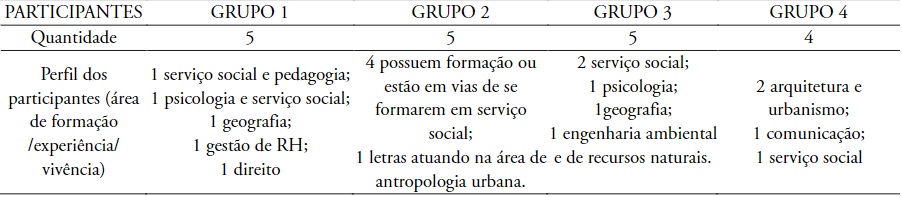 Cabe, inicialmente, uma análise do perfil da composição dos grupos que realizaram a atividade de desenvolvimento do jogo. Pode-se observar que todos os grupos possuem pelo menos um profissional da área de serviço social. Dois grupos (1 e 3) possuem um participante com formação em geografia e outro em psicologia, levando a supor que estes tenham os perfis constitutivos mais similares. Por outro lado, o grupo 2 é o que apresenta perfil constitutivo mais homogêneo, com quatro participantes da área de serviço social e um com formação em letras. Analisando somente esses perfis de composição dos grupos, percebe-se um desbalanceamento entre os participantes das áreas de ciências exatas e da terra e os das ciências humanas e sociais, sendo estes últimos significativamente preponderantes. Destaca-se a presença de somente um profissional da área de exatas (engenharia ambiental). Observa-se, ainda, uma concentração de profissionais da mesma formação num mesmo grupo (grupo 2: serviço social; grupo 4: arquitetura e urbanismo). Tendo em vista a necessidade de uma abordagem interdisciplinar do tema nas ações de ERRD, deve-se procurar envolver profissionais de diferentes disciplinas e áreas da ciência de forma mais balanceada.