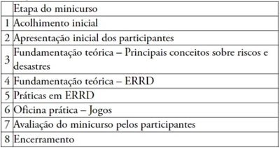 Dentre os minicursos, no dia 28 de novembro de 2019 foi realizado o intitulado “Ações educativas para a redução de riscos e desastres” 3, com duração prevista de três horas, ministrado e facilitado pelos autores do presente trabalho. O minicurso foi concebido e organizado com base na experiência de seus ministrantes/facilitadores na área de ERRD e jogos educativos para RRD (FREITAS, 2018a, 2018b; FREITAS 2019a, 2019b, 2019c, 2019d, 2019e; MENDONÇA et al., 2016, 2019a, 2019b; MENDONÇA; LUCENA, 2013; MENDONÇA; VALOIS, 2017) e em experiência anterior de oficina realizada na cidade do Pará (III CBRRD4). No Quadro 1 são apresentadas as atividades realizadas durante o minicurso, que teve uma duração total de três horas. Na sequência são apresentadas algumas informações relacionadas, sendo indicados, entre parênteses, os números correspondentes à atividade citada no quadro.