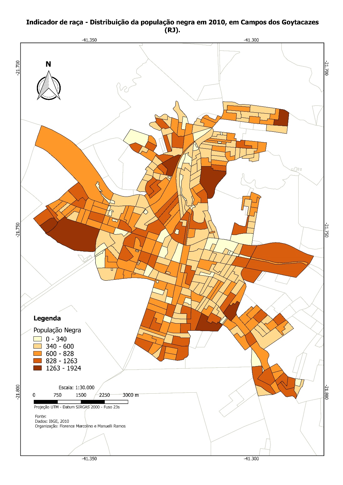 Comparando os Mapas 1 e 2, pode-se observar que a distribuição espacial da população mais empobrecida coincide com a distribuição da população negra (pretos e pardos). Observa-se, também, que são as margens da cidade, as periferias urbanas, aquelas que concentram uma grande parte dos trabalhadores pobres e negros da cidade, sujeitos submetidos cotidianamente ao racismo estrutural e institucional (ALMEIDA, 2020).
