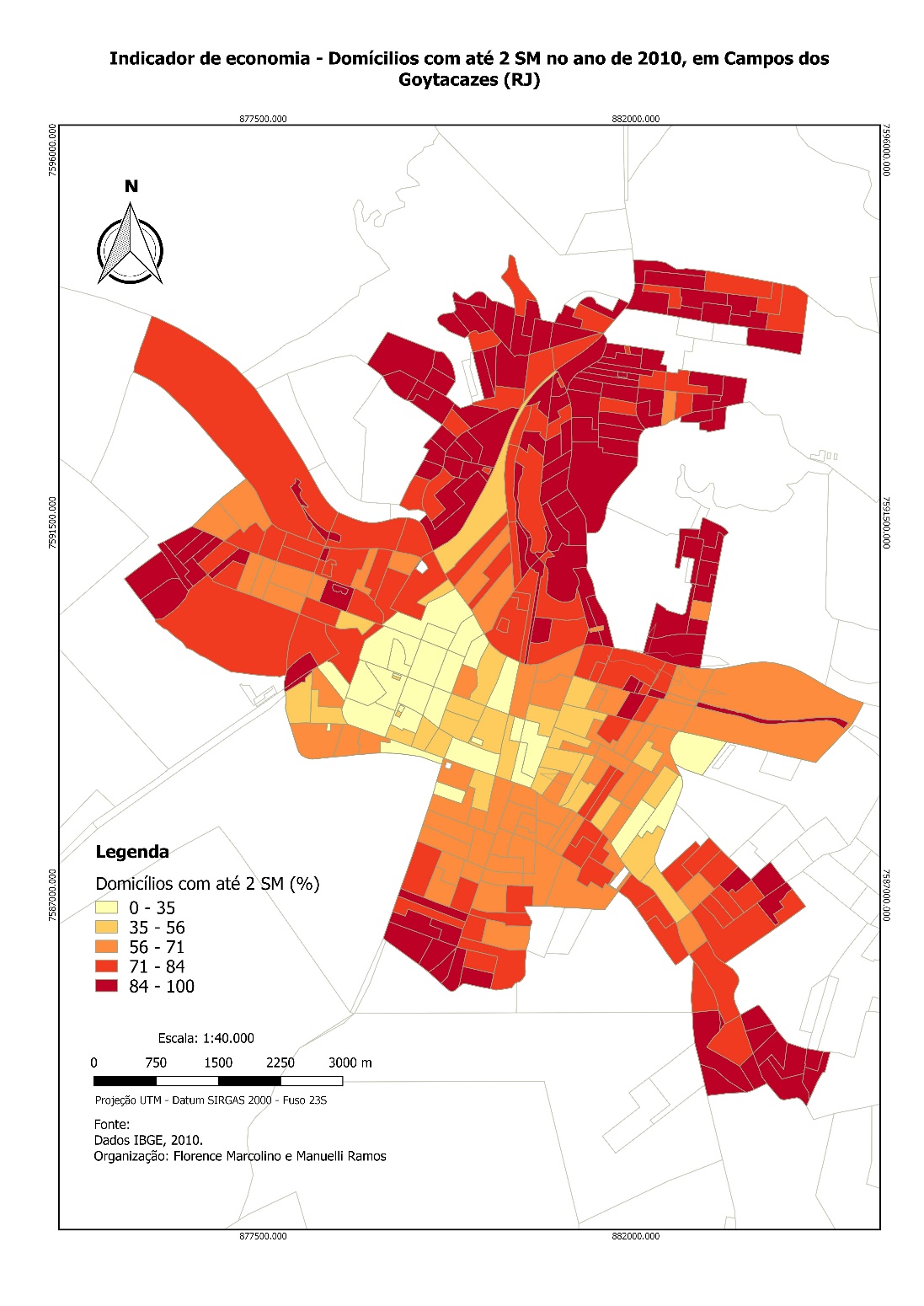 Continuando, ainda que os dados relativos ao ano de 2020 apontem para o recrudescimento da extrema pobreza no município, o Mapa abaixo com a distribuição socioterritorial das famílias em função da renda familiar, com base nos dados do Censo de 2010 (IBGE, 2010), continua funcionando como uma referência de espacialização da pobreza local na cidade de Campos, onde residem 90,29% da população (IBGE, 2010), segundo dados do CadÚnico do município (março de 2020).