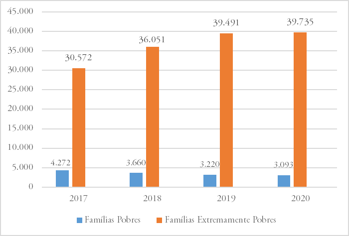 Os dados do CadÚnico de Campos (março de 2020) relativos às famílias com cadastro atualizado nos últimos 24 meses, registraram 58.792 mil famílias (ou 160.012 mil pessoas), das quais 5% são consideradas pobres e 68% extremamente pobres14. Somadas, essas famílias representam 73% do CadÚnico local, ou seja, 116.809 mil pessoas15. O Gráfico 1 apresenta o crescimento da população extremamente pobre, assim como o declínio da população pobre credenciada pelo CadÚnico local, indicando, ao contrário do que se deseja, não a saída da condição de pobreza, mas a sua inclusão no rol das famílias com renda abaixo da linha da pobreza, aquelas nomeadas de extremamente pobres.