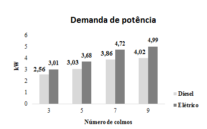 A Figura 1 apresenta a demanda de potência em função do número de colmos para os motores elétrico e diesel.