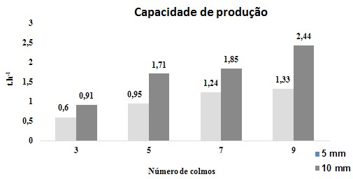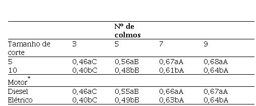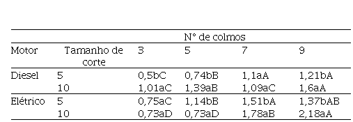 Nos resultados, conforme apresentados (Tabela 4), é possível visualizar o desdobramento dos fatores motor, tamanho de corte e número de colmos. Pode-se observar que os resultados são semelhantes aos encontrados nas outras interações, sendo que, no conjunto que apresentou maior capacidade de produção, foi utilizado motor elétrico, com a picadora regulada para corte de 10 mm e alimentada com feixes de 9 colmos. Souza et al. (2009), avaliando máquinas picadoras, observaram valores referentes à capacidade de produção de 1 a 2 t.h-1, conforme indicado pelo fabricante. Tais resultados estão bastante próximos aos encontrados no presente trabalho, que variaram entre 0,5 e 2,18 t.h-1.