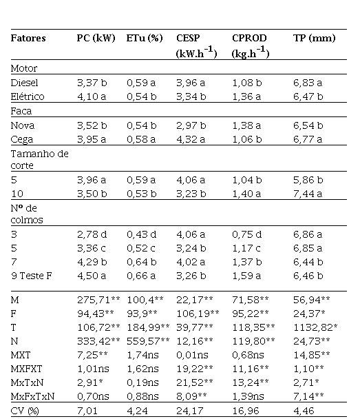 Quando se analisa o fator número de colmos (Tabela 1), constata-se que, para os valores de potência consumida, eficiência de trabalho útil e capacidade de produção, todos os quatro tratamentos apresentaram diferença estatisticamente significativa, decrescendo da alimentação de 9 colmos para a de 3 colmos.