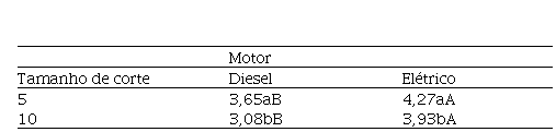 Analisando-se a interação entre os fatores tamanho de corte e tipo de motor (Tabela 2), o motor elétrico apresentou maiores valores médios de demanda de potência. Quando se observa o fator tamanho de corte dentro do fator motor, o tamanho de corte de 5 mm foi o que apresentou maiores valores médios, para os dois tipos de motor, fato esse que pode ser explicado, pois, ao se diminuir o tamanho do corte, diminui-se a velocidade de alimentação da picadora, fazendo-se necessário uma maior quantidade de vezes com que a faca passe pelo material. Resultados semelhantes também foram encontrados por Rodrigues et al. (2006), que utilizaram 3 máquinas diferentes com motor elétrico, em que se obtiveram resultados de demanda de potência variando entre 2,9 e 4,6 kW com tamanhos de corte de 5 mm e de 3,1 a 4,5 kW com tamanhos de corte de 10 mm.