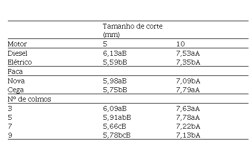 Nos desdobramentos das interações entre os fatores motor, faca e número de colmos com o fator tamanho de corte, conforme pode ser visto na Tabela 5, para todos os casos houve diferença estatisticamente significativa entre o tamanho de corte de 5 e o de 10 mm.