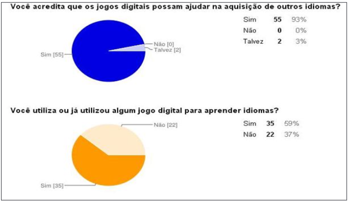Sendo assim, formularam-se duas perguntas sobre a utilização dos jogos digitais pelos usuários para a aquisição de LE. Ao analisar a primeira pergunta, observou-se que 93% dos entrevistados afirmaram acreditar que os jogos digitais podem ajudar a adquirir outros idiomas; 59% responderam à segunda pergunta afirmando que já fizeram ou fazem uso dos jogos digitais para aprender idiomas, como mostra a Figura 1.