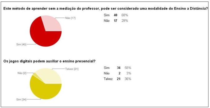 A terceira pergunta relaciona-se à aprendizagem por meio dos jogos sem a mediação do professor. Esse modo de ensino pode ser considerado um recurso para a AH, enquadrando-se na modalidade do Ensino a Distância, já que os jogos têm sido usados como recurso pedagógico por instituições de EaD (MATTAR, 2011, p.27), as quais: a) “propõem atividades que estejam indiretamente relacionadas ao universo dos games, como leituras, resenhas, debates, desenhos, etc.”; b) “exploram como os games em geral, não necessariamente os games educativos, podem colaborar com a educação.”