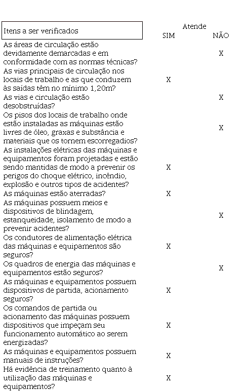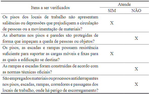 No que se refere à edificação – NR 8, onde estão localizadas as máquinas e o setor administrativo da organização, é possível perceber através da anotação na Tabela 4 que os pisos do ambiente de trabalho não possuem saliência e apresentam boa resistência para cargas móveis e fixas, porém o local não dispõe de piso antiderrapante, há risco de queda de pessoas e objetos, e as rampas e escadas estão fora da especificação das normas técnicas oficiais, tornando o ambiente propício para a ocorrência de acidentes, conforme descreve Rodrigues et al. (2012).
