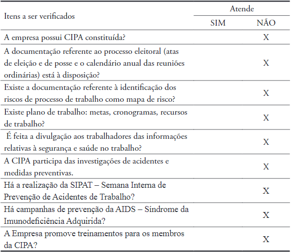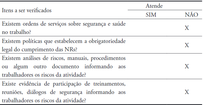 Após a realização da entrevista, análise de documentos e visita no ambiente do trabalho, foi preenchida a lista de verificação das normas regulamentadoras aplicadas, conforme consta nas tabelas de 1 a 7. A fim de esclarecer as respostas, cada item normativo foi debatido com os gestores e analisada a documentação comprobatória e as práticas de trabalho.