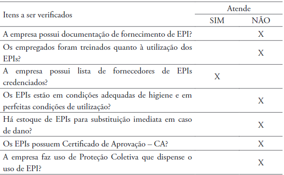 A falha no fornecimento, controle e gestão dos equipamentos de proteção individual ainda muito comum em algumas empresas, que acarreta a possibilidade de lesão e de doença ocupacional (MAFRA; SILVA; CARLOS, 2011), está associada à ausência ou limitação do PPRA (Tabela 5), também não praticado na empresa, necessário para identificação e controle dos riscos ambientais (MIRANDA; DIAS, 2004).