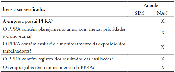 Perante o Programa de Prevenção de Riscos Ambientais – PPRA, que tem como objetivo a prevenção e o controle da exposição ocupacional aos riscos químicos, físicos e biológicos presentes nos locais de trabalho (MIRANDA; DIAS, 2004), a empresa não tem adotado as práticas descritas na normativa de número 9 do MTE (Tabela 5), o que impossibilita a identificação de fontes geradoras de agravo à saúde do trabalhador e coíbe o planejamento para a implementação de ações de controle.