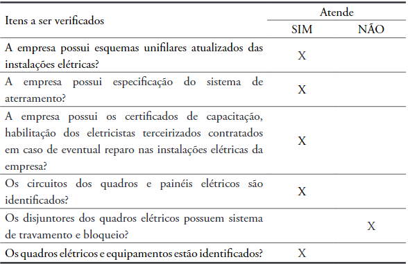 As instalações elétricas da empresa, observadas durante a pesquisa, indicam uma maior adoção aos preceitos regulamentares da NR 10 (Tabela 6), quando notados os aterramentos, documentação das orientações de trabalho e dos esquemas unifilares. Apresentam, porém, falhas nos quadros elétricos, que não têm identificação e não são mantidos bloqueados. Ressaltamos aqui que os acidentes com eletricidade variam de um simples choque elétrico a um que pode levar à morte, o que é muitas vezes resultado da negligência de quem instala ou daqueles que arriscam a mexer em circuitos energizados (BRAGA, 2008).