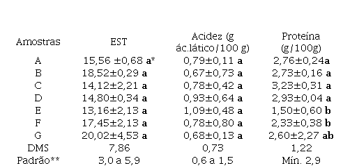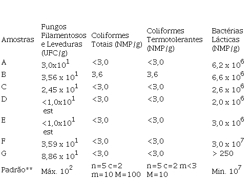 * As médias, em uma mesma linha, seguidas pela mesma letra não diferem estatisticamente entre si (p>0,05) pelo Teste de Tukey ao nível de 5% de probabilidade. DMS - Diferença mínima significativa.** Refere-se ao padrão da legislação (BRASIL, 2007).Na Tabela 2 observam-se os resultados das análises microbiológicas das amostras de iogurtes analisadas. Entre os iogurtes analisados, foram encontradas variações nas populações de fungos filamentosos e leveduras de <1,0x101est a 8,86 x 101UFC/g, sendo que todas as amostras estão aptas ao consumo por não ultrapassarem o limite permitido pela legislação. A amostra G apresentou maior contagem de fungos filamentosos e leveduras quando comparada às demais. A presença desses microrganismos em iogurte é um indicativo de práticas sanitárias insatisfatórias na fabricação ou na embalagem do produto.