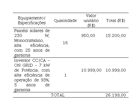 Para exemplificação do custo de um sistema fotovoltaico com conexão à rede, a Tabela 1 mostra os valores dos principais componentes (PFVs e inversor CC/CA interativo) de um micro-SFCR. O levantamento desses custos foi alinhado para um consumo de energia elétrica de aproximadamente 552 kWh/mês com 5 h/dia de sol pleno. De acordo com o consumo de energia solicitado chegou-se a um valor de R$ 26.199,00 para aquisição do sistema. Vale destacar que nesse levantamento não foram inclusos os custos com o projeto, materiais diversos (estrutura para fixação dos PFVs, dispositivos de proteção contra surto, cabos elétricos, quadros elétricos) e mão de obra para instalação. Os custos do projeto, materiais diversos e mão de obra variam com as condições específicas de cada instalação.