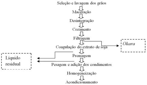 Os grãos de soja foram lavados em água corrente e selecionados, imersos em recipiente com água filtrada e deixados de molho por uma noite (8 a 10 horas), à temperatura ambiente. No dia seguinte, os grãos hidratados foram retirados da água e lavados em água corrente, por três vezes. Ocorreu a desintegração com água filtrada no liquidificador por aproximadamente 3 minutos, na proporção de uma parte de soja para uma parte de água. A massa obtida da desintegração foi transferida para uma panela com água aquecida, na proporção adequada para a formulação, e submetida ao cozimento até fervura; logo após foi filtrada em um tecido próprio. O resíduo obtido da filtração é o okara.