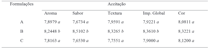 As formulações A e C não apresentaram diferença significativa (p>0,05) para os atributos sabor, aroma, textura e impressão global.