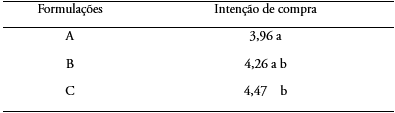 Percebeu-se que, para a análise de intenção de compra, as amostras A e B não diferiram estatisticamente (p>0,05) estando entre os termos certamente compraria e provavelmente compraria. As amostras B e C não diferiram significativamente (p>0,05) entre elas, sendo que a amostra A diferiu-se da amostra C no nível de 5% de significância (Tabela 3).