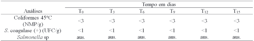 As análises microbiológicas de coliformes termotolerantes (45ºC), Staphylococcuscoagulase positiva e Salmonelasp. foram realizadas nos tempos (0, 3, 6, 12 e 15 dias de armazenamento), de acordo com os Métodos Analíticos Oficiais da Instrução Normativa n.º 62 de 26 de agosto de 2003 (BRASIL, 2003) prevista pela RDC n.º 12, de 2 de janeiro de 2001, para pasta de soja fermentada e similares, desengordurada ou não.