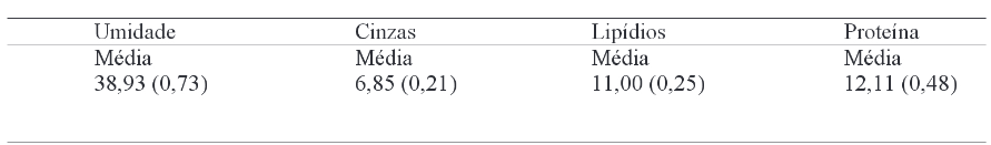 A Tabela 5 apresenta os percentuais de umidade, cinza, lipídios e proteína nas diferentes repetições da formulação B, encontrados nas análises efetuadas.