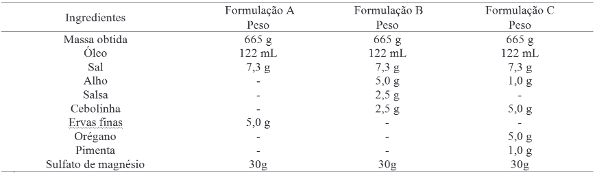Os ingredientes utilizados na elaboração das três formulações da pasta de soja foram: soja em grão, óleo de soja, sal, sulfato de magnésio, orégano, salsa, cebolinha, pimenta calabresa, alho e ervas finas. Todos os componentes foram adquiridos no comércio local. As quantidades de ingredientes utilizados estão dispostas na Tabela 1.